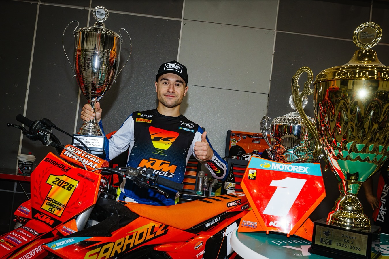 Der Franzose Calvin Fonvieille (KTM Sarholz Racing Team) feierte am Freitagabend einen überragenden Start-Ziel-Sieg. Nachdem er sich den Holeshot gesichert hatte, kontrollierte er das 15-Runden-Rennen souverän an der Spitze und holte damit seinen zweiten Tagessieg in Dortmund. „2019 stand ich hier zum ersten Mal auf dem Podium. Letztes Jahr habe ich Samstagabend gewonnen und dann die Meisterschaft – das ist auch in diesem Jahr das Ziel. Ich freue mich, meinem Team mit diesem Sieg etwas zurückgeben zu können“, erklärte ein glücklicher Fonvieille nach dem Rennen.